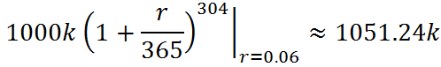 接下来,让我们再来脑洞大开一下:如果银行不是按照每月来结算利息,而是按照天来计算复利呢?直觉告诉我们,我们会被银行压榨的非常多。那到底是多少呢,让我们来计算一下:一年共有365 天,而10 个月也就是304天,代入上面的公式我们本息总额有