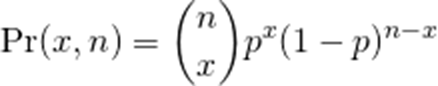 我们知道,对于投掷硬币来说,如果是同一颗硬币(其正面向上的概率已经给定),那么掷硬币试验得到的正面向上的频数是符合二项分布的。对于一个正面向上概率为p的硬币来说,总共抛硬币n 次,x 次向上的事件发生的概率为: