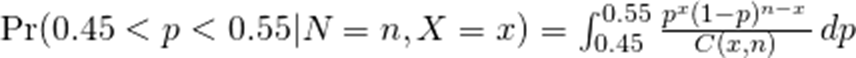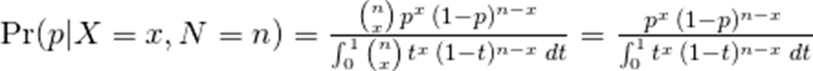 那么,假设硬币正面向上的先验概率是均匀分布的,我们从抛n次试验观察到x次正面向上可以得出硬币正面向上的后验概率是: