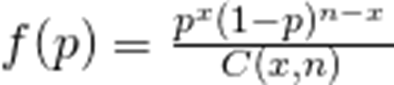 当p = x / n 时,其概率函数Pr (p|X=x, N=n) 取得最大值,这也是通过观察对硬币正面向上概率p 的最佳估计(最大后验估计)。